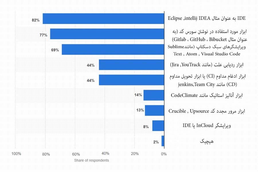 طبق آمار، ابزار های توسعه یا برنامه نویسی که از سال 2018 توسط توسعه دهندگان نرم افزار در سراسر جهان استفاده شده است، در زیر آورده شده است: